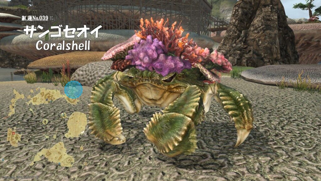 FF14 紅蓮No.039 サンゴセオイ(Coralshell) さにすと 2026年4月20日 No.039 サンゴセオイ(Coralshell) 分類:衆生門 水棲綱 メガロクラブ属 生息地:紅玉海技: ドロップ品: ゲーム内情報: 考察: モンスター図鑑 蒼天のイシュガルド
