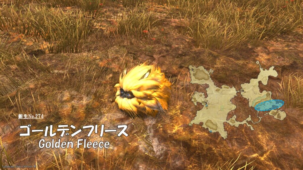 FF14 新生No.274 ゴールデンフリース(Golden Fleece) さにすと 2026年3月19日 No.274 ゴールデンフリース(Golden Fleece) 分類:超常門 妖精綱 ファーブル属 生息地:東ザナラーン技:エアロ 魔法ストンスキン 10%ダメージ無効 ドロップ品: スナーブルのたてがみ ゲーム内情報: 考察: モンスター図鑑