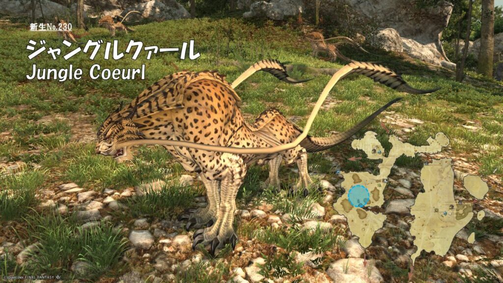 FF14 新生No.230 ジャングルクァール(Jungle Coeurl) さにすと 2026年1月26日 No.230 ジャングルクァール(Jungle Coeurl) 分類:衆生門 六識綱 クァール属 生息地:高地ラノシア技:チャージドホイスカー 敵中心円範囲+麻痺 ドロップ品: ゲーム内情報: 考察: モンスター図鑑
