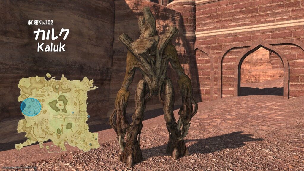 FF14 紅蓮No.102 カルク(Kaluk) さにすと 2026年4月21日 No.102 カルク(Kaluk) 分類:衆生門 草木綱 ウッドマン属 生息地:ギラバニア湖畔地帯技: ドロップ品: ゲーム内情報: 考察: モンスター図鑑 紅蓮のリベレーター