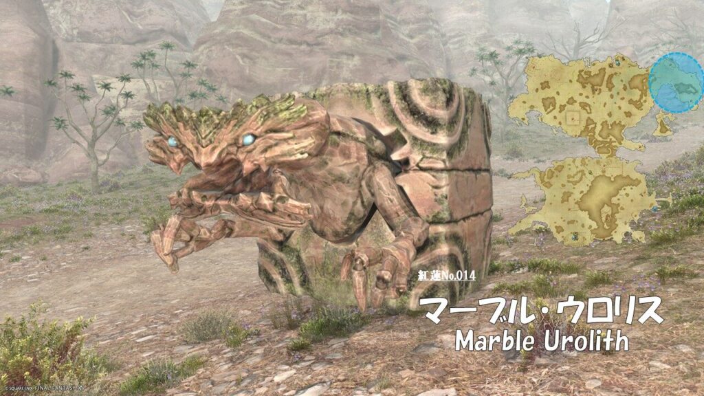 FF14 紅蓮No.014 マーブル・ウロリス(Marble Urolith) さにすと 2026年4月20日 No.014 マーブル・ウロリス(Marble Urolith) 分類:無情門 呪具綱 ウロリス属 生息地:ギラバニア山岳地帯技: ドロップ品: ゲーム内情報: 考察: モンスター図鑑 蒼天のイシュガルド