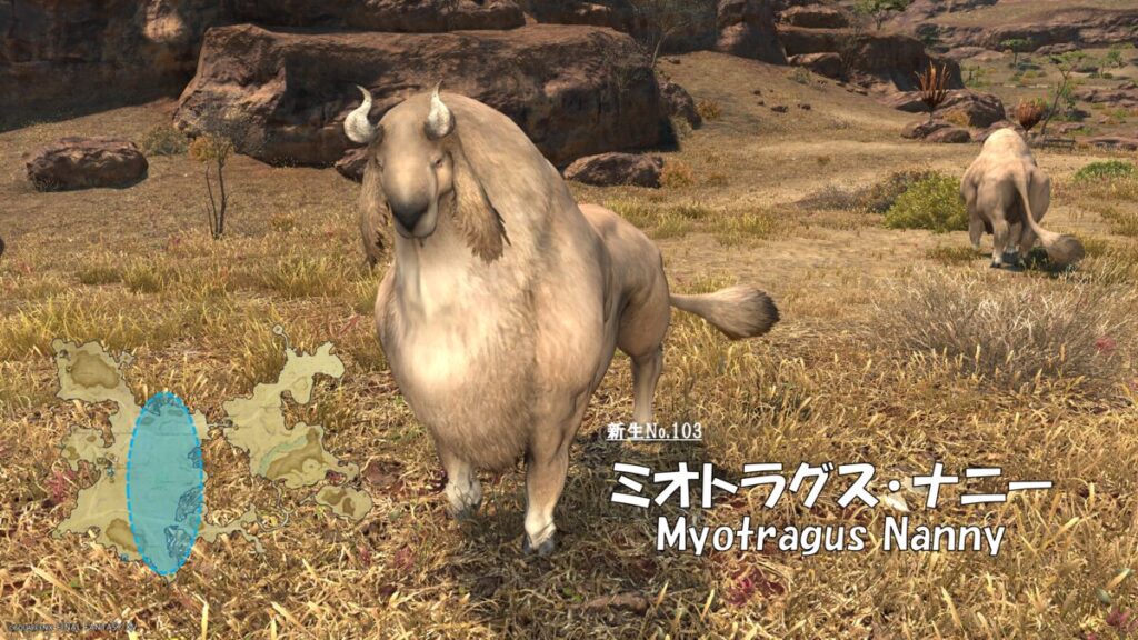 FF14 新生No.103 ミオトラグス・ナニー(Myotragus Nanny) さにすと 2026年3月19日 No.103 ミオトラグス・ナニー(Myotragus Nanny) 分類:衆生門 百獣綱 アルドゴート属 生息地:東ザナラーン技: ドロップ品: アルドゴートの肩肉アルドゴートの角アルドゴートの粗皮 ゲーム内情報: 考察: モンスター図鑑