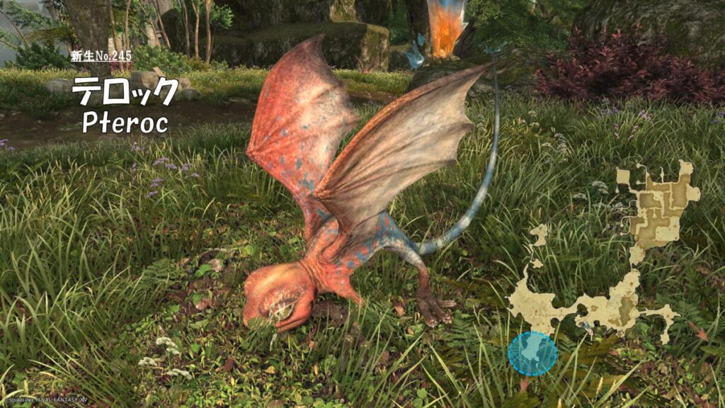 FF14 新生No.245 テロック(Pteroc) さにすと 2026年1月26日 No.245 テロック(Pteroc) 分類:衆生門 有翼綱 プーク属 生息地:外地ラノシア技:バックフリップ 前方扇範囲ファイアボール 対象中心円範囲 ドロップ品: プークの卵プークの翼 ゲーム内情報: 考察: モンスター図鑑