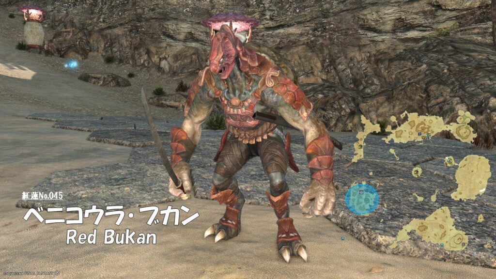 FF14 紅蓮No.045 ベニコウラ・ブカン(Red Bukan) さにすと 2026年4月20日 No.045 ベニコウラ・ブカン(Red Bukan) 分類:衆生門 六識綱 コウジン属 生息地:紅玉海技: ドロップ品: ゲーム内情報: 考察: モンスター図鑑 蒼天のイシュガルド