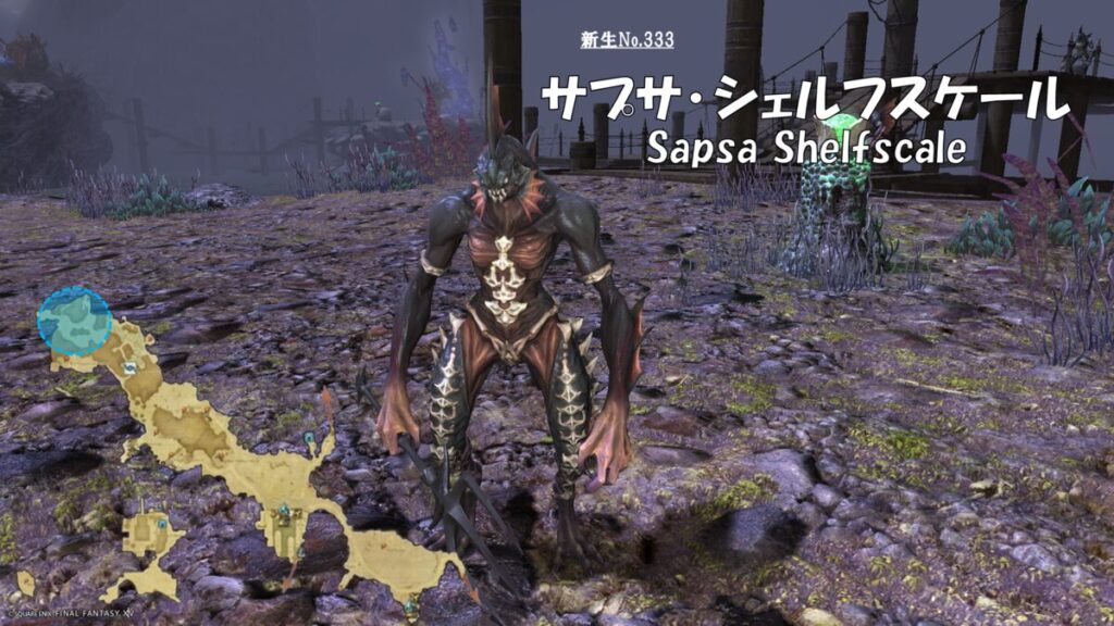 FF14 新生No.333 サプサ・シェルフスケール(Sapsa Shelscale) さにすと 2026年1月22日 No.333 サプサ・シェルフスケール(Sapsa Shelscale) 分類:衆生門 六識綱 サハギン属 生息地:西ラノシア技:エンウォーター 水属性付与トゥルースラスト WS ドロップ品: ゲーム内情報: 考察: モンスター図鑑