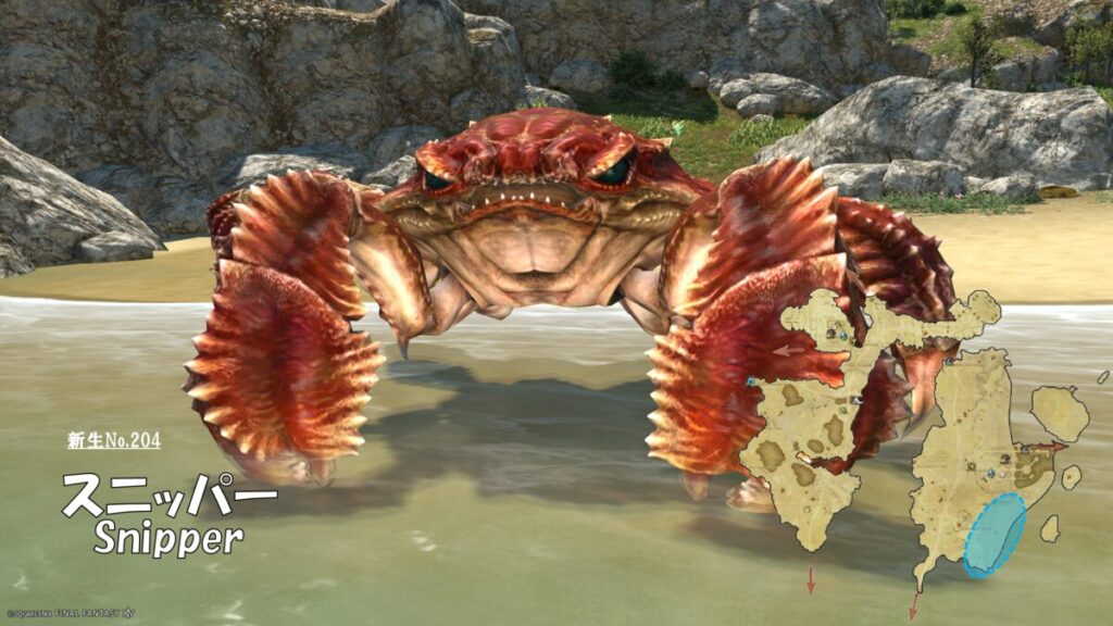 FF14 新生No.204 スニッパー(Snipper) さにすと 2026年1月26日 No.204 スニッパー(Snipper) 分類:衆生門 水棲綱 メガロクラブ属 生息地:東ラノシア技:バブルシャワー 前方扇範囲 ドロップ品: スニッパーの甲殻 ゲーム内情報: 考察: モンスター図鑑