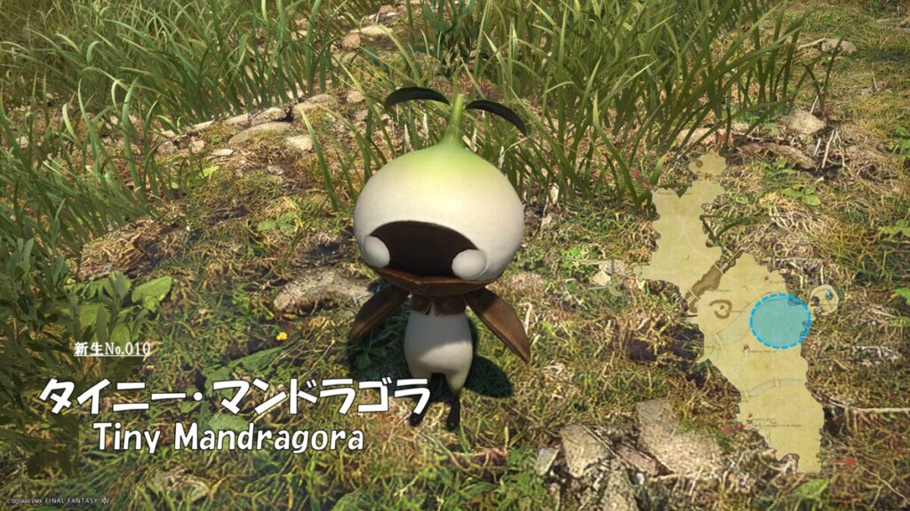 FF14 新生No.010 タイニー・マンドラゴラ(Tiny Mandragora) さにすと 2026年1月14日 No.010 タイニー・マンドラゴラ(Tiny Mandragora) 分類:衆生門 草木綱 マンドラゴラ属 生息地:中央ラノシア低地ラノシア技:AAのみ ドロップ品: ゲーム内情報: 考察:Mandragoraはナス科の多年草で、地中海沿岸に分布する植物。根が人間の形に似ており、引き抜くと悲鳴を上げて聞く者を死に至らしめるとされる伝説がある。FF14のマンドラゴラはもうすでに表出しているモンスターで、出てきた後には特に害がないということなんだろうか。 モンスター図鑑