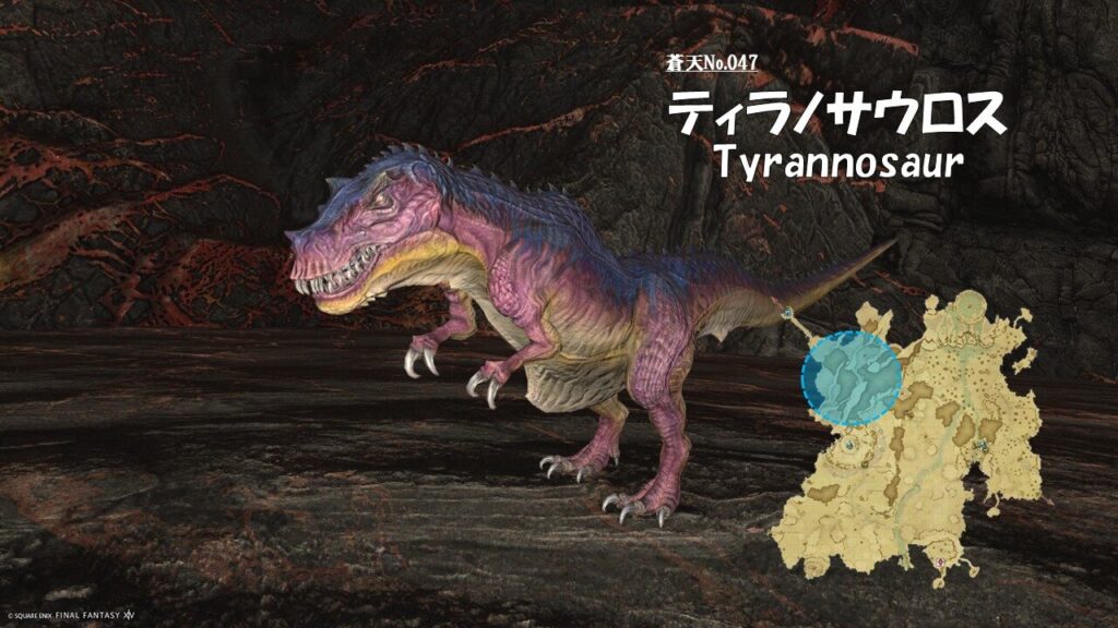 FF14 蒼天No.047 ティラノサウルス(Tyrannosaur) さにすと 2026年4月19日 No.047 ティラノサウルス(Tyrannosaur) 分類:衆生門 甲鱗綱 ティラノサウルス属 生息地:高地ドラヴァニア技: ドロップ品: ゲーム内情報: 考察: モンスター図鑑 蒼天のイシュガルド