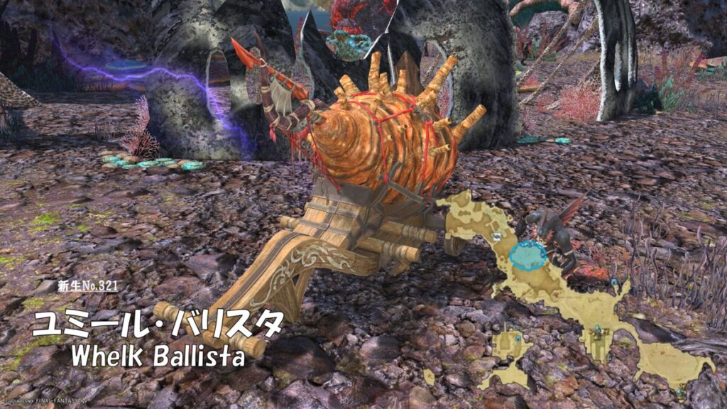 FF14 新生No.321 ユミール・バリスタ(Whelk Ballista) さにすと 2026年1月21日 No.321 ユミール・バリスタ(Whelk Ballista) 分類:アーティファクト(人工物) 生息地:西ラノシア技:雷撃 対象中心円範囲 ドロップ品: ゲーム内情報: 考察: モンスター図鑑