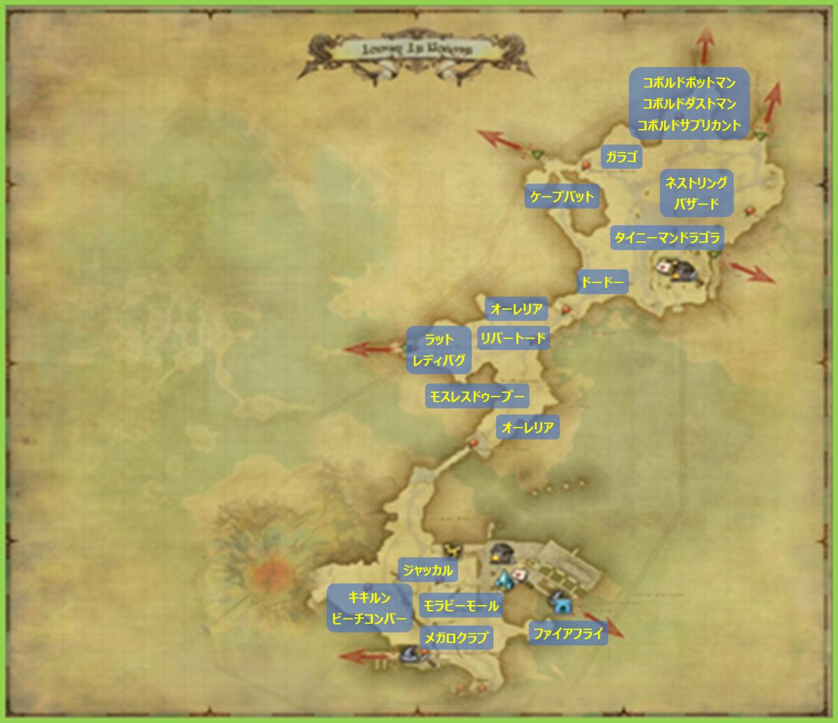 FF14 FF14モンスター図鑑 低地ラノシア さにすと 2025年11月15日 / 2026年1月14日 モンスター配置図 各モンスターをご紹介していきます。画像をクリックしていただくと、個別のページに飛びます。個別のページでは、そのモンスターの技や小ネタなどを記載しています。 No.003 ラット(Wharf Rat) No.002 レディバグ(Little Ladybug) No.020 リバートード(Rivertoad) No.021 オーレリア(Aurelia) No.022 ドードー(Wild Dodo) No.010 タイニー・マンドラゴラ(Tiny Mandragora) No.023 ケープバット(Cave Bat) No.024 ガラゴ(Galago) No.025 ネストリング・バザード(Nesting Buzzard) No.026 コボルド・サプリカント(Kobold Supplicant) No.027 コボルド・ダストマン(Kobold Dustman) No.028 コボルド・ポットマン(Kobold Potman) No.018 ジャッカル(Wild Jackal) No.029 モラビーモール(Moraby Mole) No.030 キキルン・ビーチコンバー(Qiqirn Eggdigger) No.015 メガロクラブ(Megalocrab) No.031 ファイアフライ(Firefly) No.019 モスレスグゥーブー(Mossless Goobbue) FF14 モンスター図鑑 このページでは、FF14に登場するモンスターを網羅していきます。トップページとしてリンクを貼るので、それぞれの目的に合わせてご覧いただ...