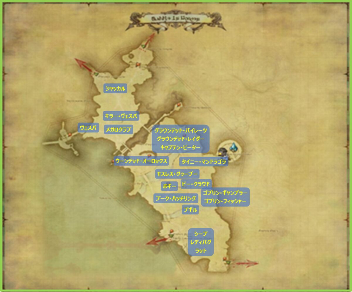 FF14 FF14モンスター図鑑 中央ラノシア さにすと 2025年11月15日 / 2026年1月14日 モンスター配置図 各モンスターをご紹介していきます。画像をクリックしていただくと、個別のページに飛びます。個別のページでは、そのモンスターの技や小ネタなどを記載しています。 No.001 シープ(Lost Lamb) No.002 レディバグ(Little Ladybug) No.003 ラット(Wharf Rat) No.004 プギル(Pugil) No.005 ゴブリン・ギャンブラー(Goblin Gambler) No.006 ゴブリン・フィッシャー(Goblin Fisher) No.007 プーク・ハッチリング(Puk Hatchling) No.008 ビー・クラウド(Bee Cloud) No.009 ボギー(Bogy) No.010 タイニー・マンドラゴラ(Tiny Mandragora) No.011 グラウンデッド・パイレーツ(Grounded Pirate) No.012 グラウンデッド・レイダー(Grounded Raider) No.013 キャプテン・ピーター(Captain Petyr Pigeontoe) No.014 ウーンデッド・オーロックス(Wounded Aurochs) No.015 メガロクラブ(Megalocrab) No.016 ヴェスパ(Wespe) No.017 キラー・ヴェスパ(Killer Wespe) No.018 ジャッカル(Wild Jackal) No.019 モスレスグゥーブー(Mossless Goobbue) FF14 モンスター図鑑 このページでは、FF14に登場するモンスターを網羅していきます。トップページとしてリンクを貼るので、それぞれの目的に合わせてご覧いただ...